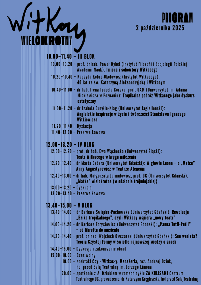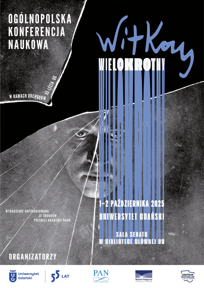 Dziś także 2 października o godz. 18:00 w holu przed Salą Teatralną na Wydziale Filologicznym UG odbędzie się spektakl w reżyserii Andrzeja Dziuka: „CCY-WITKACY” oraz o 20:00 spotkanie z reżyserem i twórcą Teatru Witkacego w Zakopanem, które poprowadzi dr Katarzyna Kręglewska z Centrum Teatralnego im. prof. Jana Ciechowicza i Wydziału Filologicznego UG.