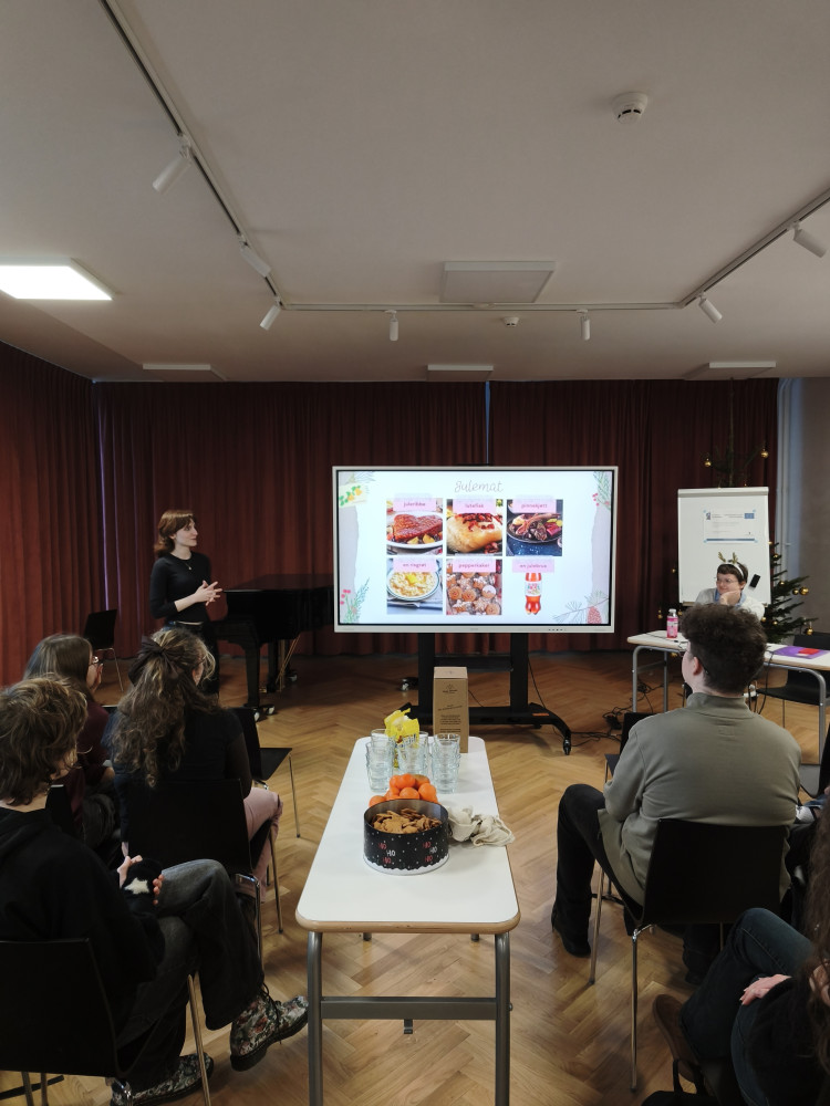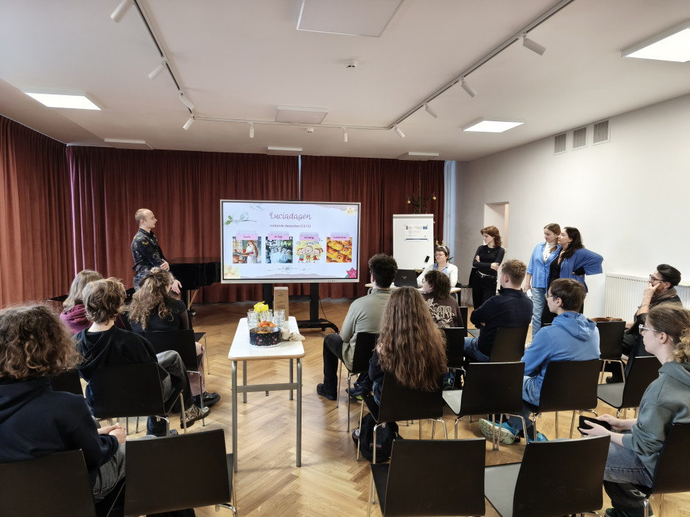 Podczas spotkania nasi studenci zaprezentowali tradycje związane z obchodami dnia św. Łucji, opowiedzieli o norweskich zwyczajach oraz przybliżyli słownictwo towarzyszące tym obrzędom. Wspólnie nauczyliśmy się i wykonaliśmy klasyczną norweską piosenkę Musevisa, co stało się radosnym i integrującym akcentem zajęć.