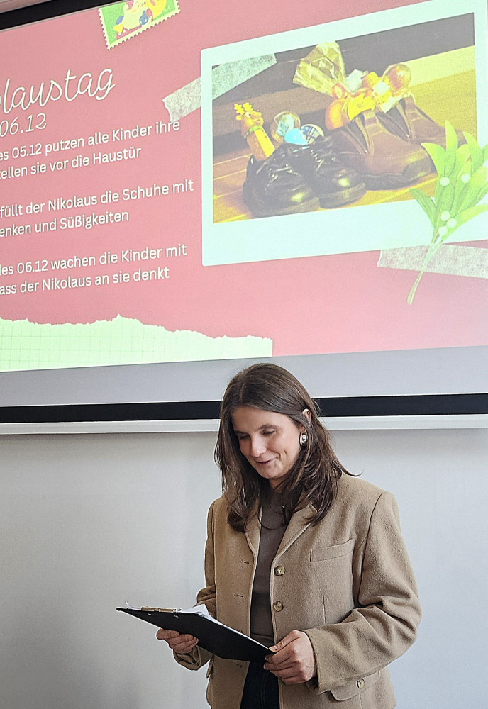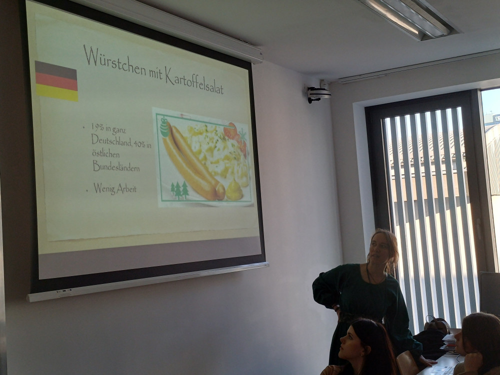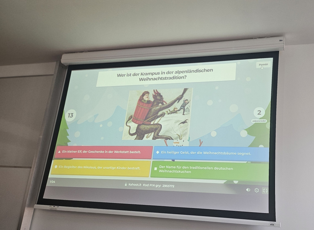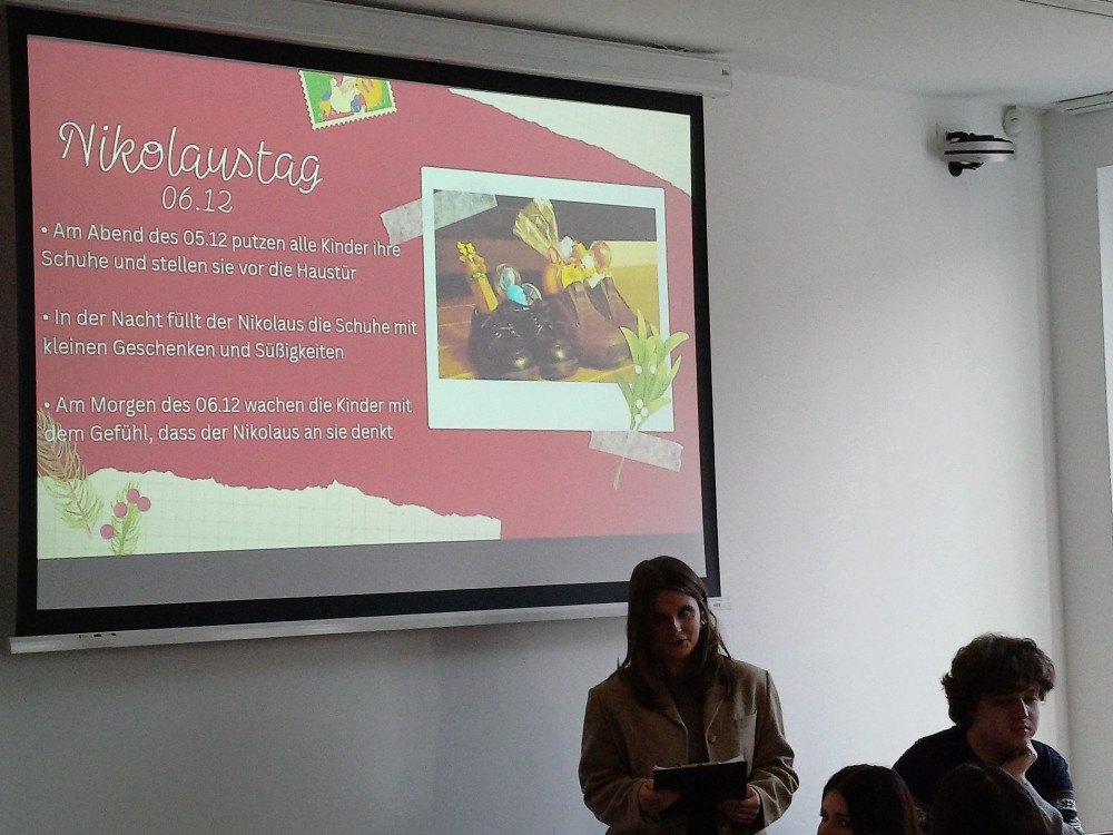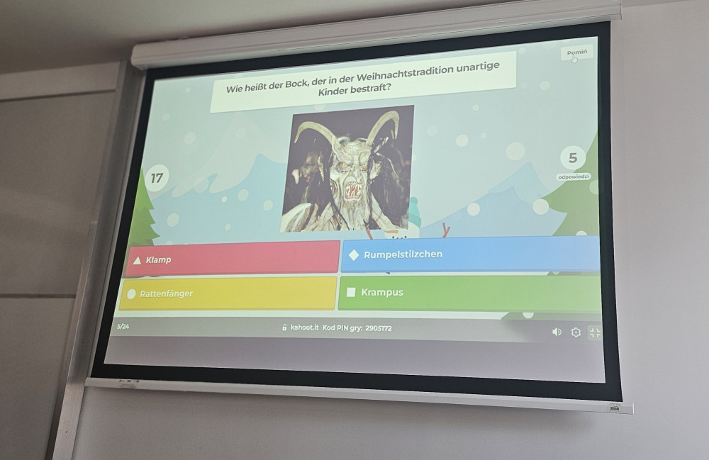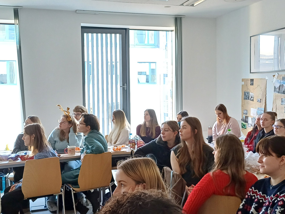 Jak co roku prowadzące zajęcia PNJN — dr Marta Bieszk, mgr Małgorzata Błaszkowska, mgr Anna Pior-Kucińska, dr Helena Walczak oraz dr Monika Szafrańska — przeznaczyły ostatni dzień zajęć dydaktycznych na wspólne spotkanie studentów całego I roku filologii germańskiej oraz niemcoznawstwa. Był to czas kolędowania, integracji oraz poznawania tradycji świątecznych krajów obszaru DACH. Nie zabrakło quizów, zagadek i dobrej zabawy. Spotkanie miało szczególną wartość integracyjną — dla części licznego I roku była to bowiem jedna z pierwszych okazji do bliższego poznania się.