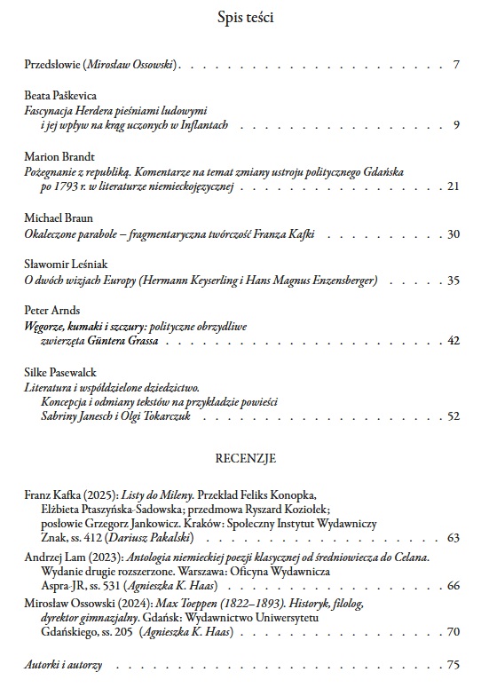 Ukazał się 52 numer czasopisma „Studia Germanica Gedanensia”. Tom zatytułowany Literatura niemiecka w dialogu z kulturami Europy Wschodniej zawiera sześć artykułów naukowych poświęconych wymianie kulturowej w literaturze niemieckiej z różnych okresów. Udostępniono w nim w polskim przekładzie wykłady wygłoszone przez zagranicznych badaczy w roku akademickim 2023/2024 w ramach „Roku Herdera na Uniwersytecie Gdańskim”, zorganizowanego w okresie obejmującym 280. jubileusz urodzin i 220. rocznicę śmierci Johanna Gottfrieda Herdera (1744-1803), wybitnego poety i filozofa, przedstawiciela i krytyka oświecenia, teoretyka okresu burzy i naporu, reprezentanta klasyki weimarskiej, który wywarł znaczący wpływ na rozwój idei narodu oraz filozofii i historii kultury. Pokłosiem Roku Herdera są teksty prof. Petera Arndsa z Kolegium Trójcy Świętej w Dublinie, prof. Michaela Brauna z Fundacji Konrada Adenauera w Berlinie i Uniwersytetu w Kolonii, dr Silke Pasewalck z Federalnego Instytutu ds. Kultury i Historii Niemców w Europie Wschodniej (BKGE) w Oldenburgu oraz dr Beaty Paškevicy z Biblioteki Narodowej Łotwy w Rydze. Materiały te zostały poszerzone o dwa artykuły pracowników Instytutu Filologii Germańskiej UG prof. Marion Brandt i prof. Sławomira Leśniaka. Celem publikacji, wydanej pod reakcją prof. Mirosław Ossowskiego, było skupienie się na pisarzach, którzy nawiązują do idei Herdera i odgrywają rolę pośredników kulturowych, np. rozbudzają w Niemczech zainteresowanie kulturami Europy Środkowej i Wschodniej.