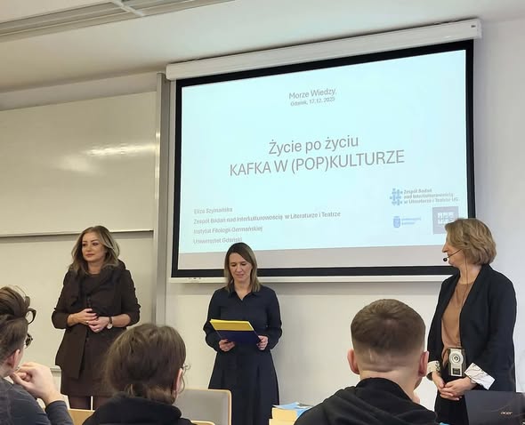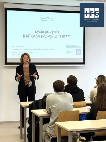 Im Rahmen des Projekts „Morze wiedzy“ [Meer des Wissens], das von Dr. Dominika Janus und Dr. Iza Kujawa vom Forschungsteam für Text und Diskurs durchgeführt wird, fand am 17. Dezember 2025 ein populärwissenschaftlicher Vortrag von Prof. Eliza Szymańska mit dem Titel „Leben nach dem Leben. Kafka in der (Pop-)Kultur“ statt.